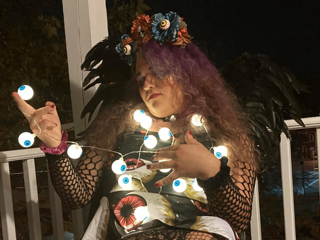 Olivia as the demon Bat Melekh (Princess – Shabbat 109a), wearing an eyeball dress, eyeball string of light, eyeball/flower tiara, black wings, and black mesh sleeves. Sitting on a porch at night.