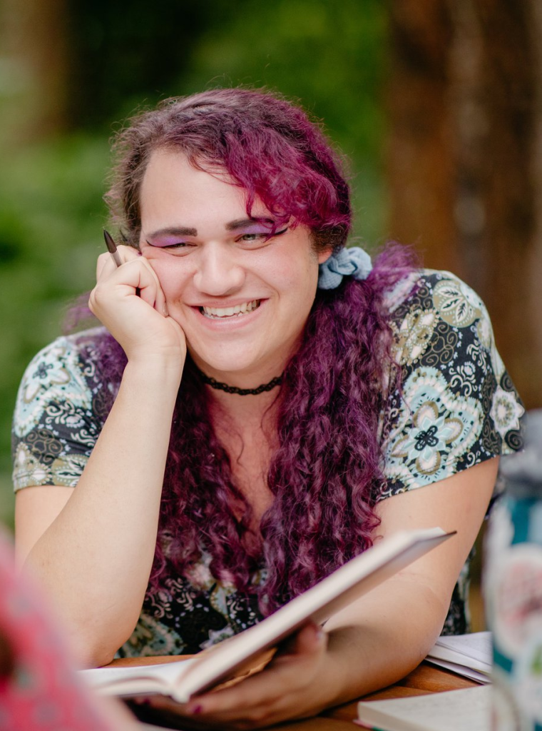 Olivia at Queer Talmud Camp 2019, curly purple hair, green dress, outside with an open volume of Talmud. Photo by Laurel Cohen.
