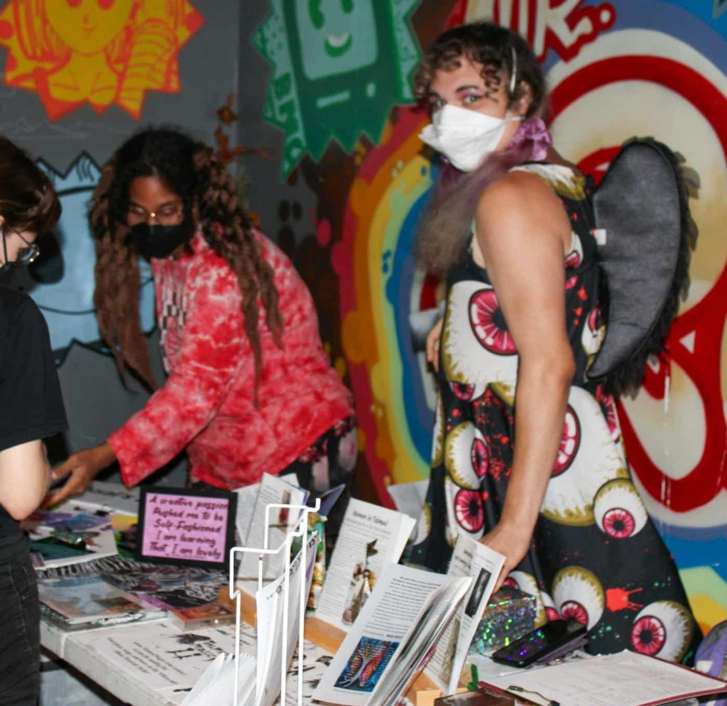 Olivia at the Pittsburgh Jewish Zine Fair (August 2025) in eyeball dress, wings, and white 3M V-Flex N95 mask stands in front of a colourfully graffiti wall. Their class packettes turned zines are on full display. Beside them, friend Nsai Temko shares their fantasy zines with community members. Photo by Anastasia bat Lilith of Stormbringer Press.