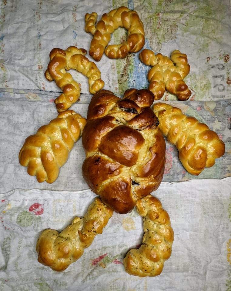 A golem is most traditionally a clay creature, animated through magical Jewish shaping and incantations. Here I have made a torso, arms, and legs, made of braided bread. Instead of a head, we have the letters alef-mem-tav, EMET “truth,” often written on a Golem’s forehead to bring it to life. To de-animate a golem, the alef is removed, leaving only MET “death.” What part of the body would you eat first?